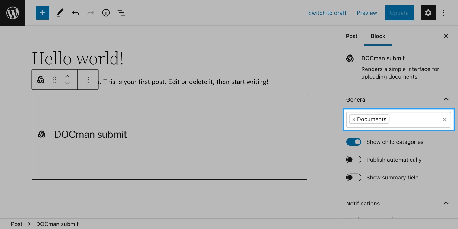 Additionally you may insert an DOCman submit block on any page or post by making sure to configure the block category to point to the Documents category.