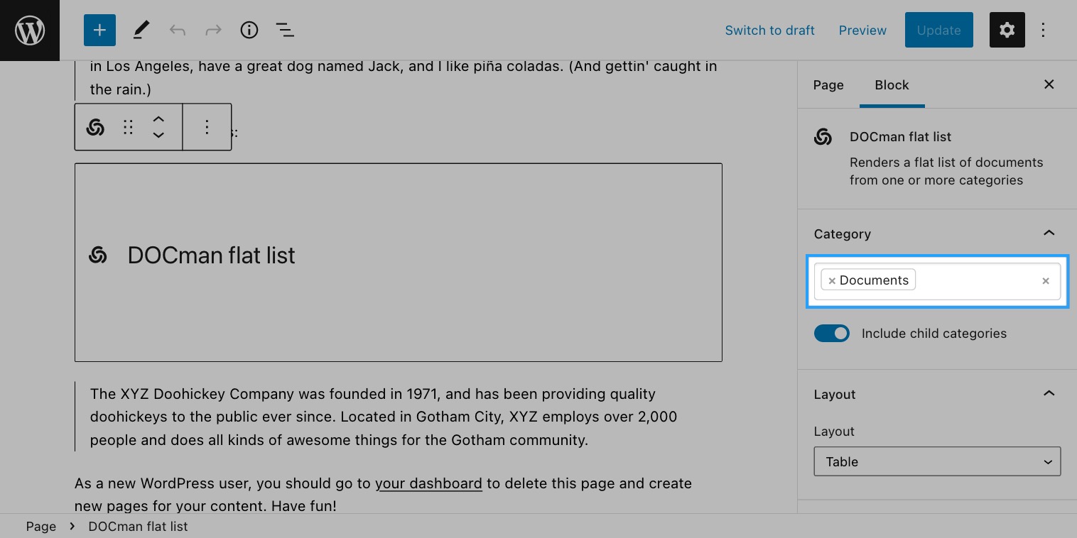 - Add a Flat Documents List block on a post or page of your choice