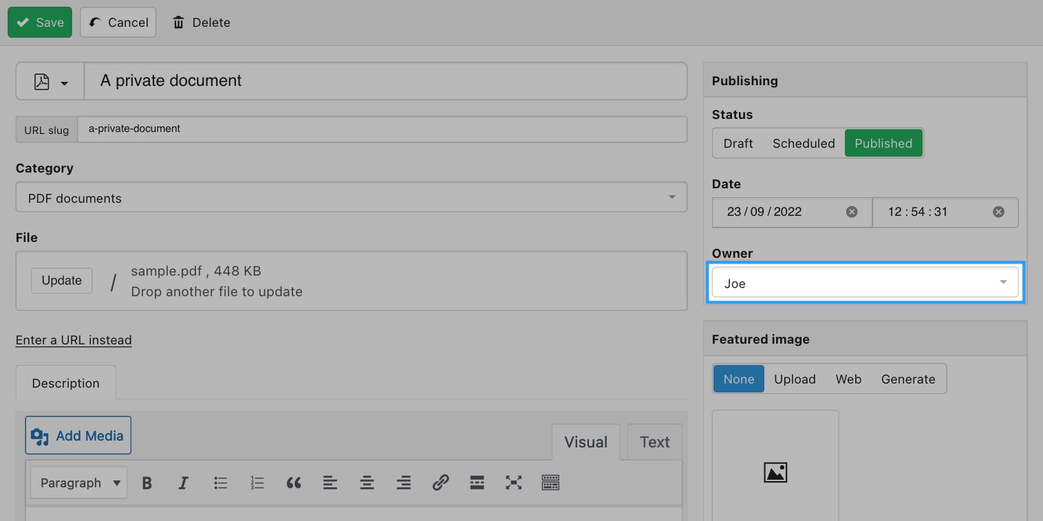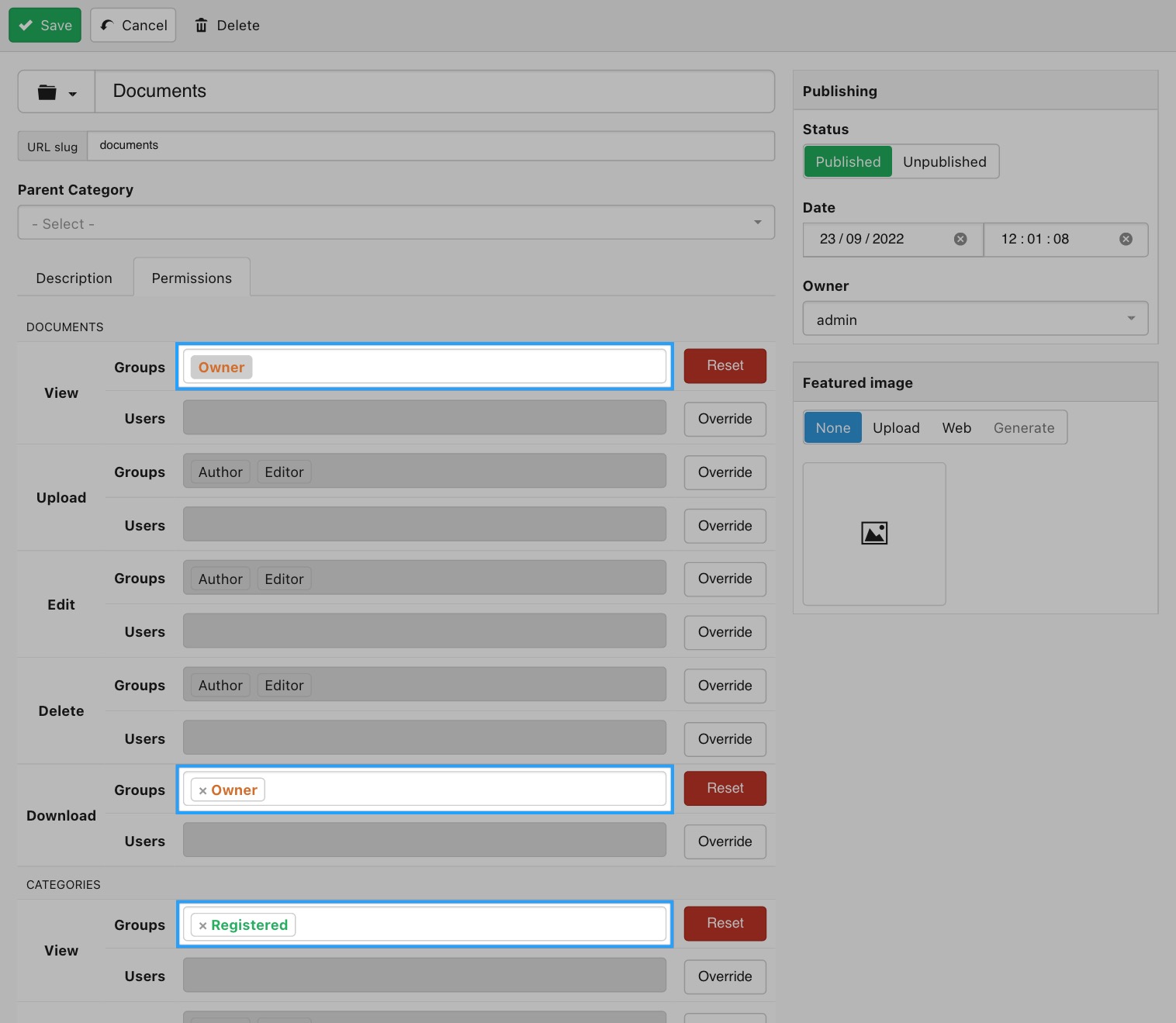 Tip: When setting the permissions, you can do the same on a parent category or even in the global Documents > Settings view instead of assigning the same settings on each category containing documents that you want to share individually. Permissions are inherited from global settings and parent categories saving you from having to set them on each individual category.