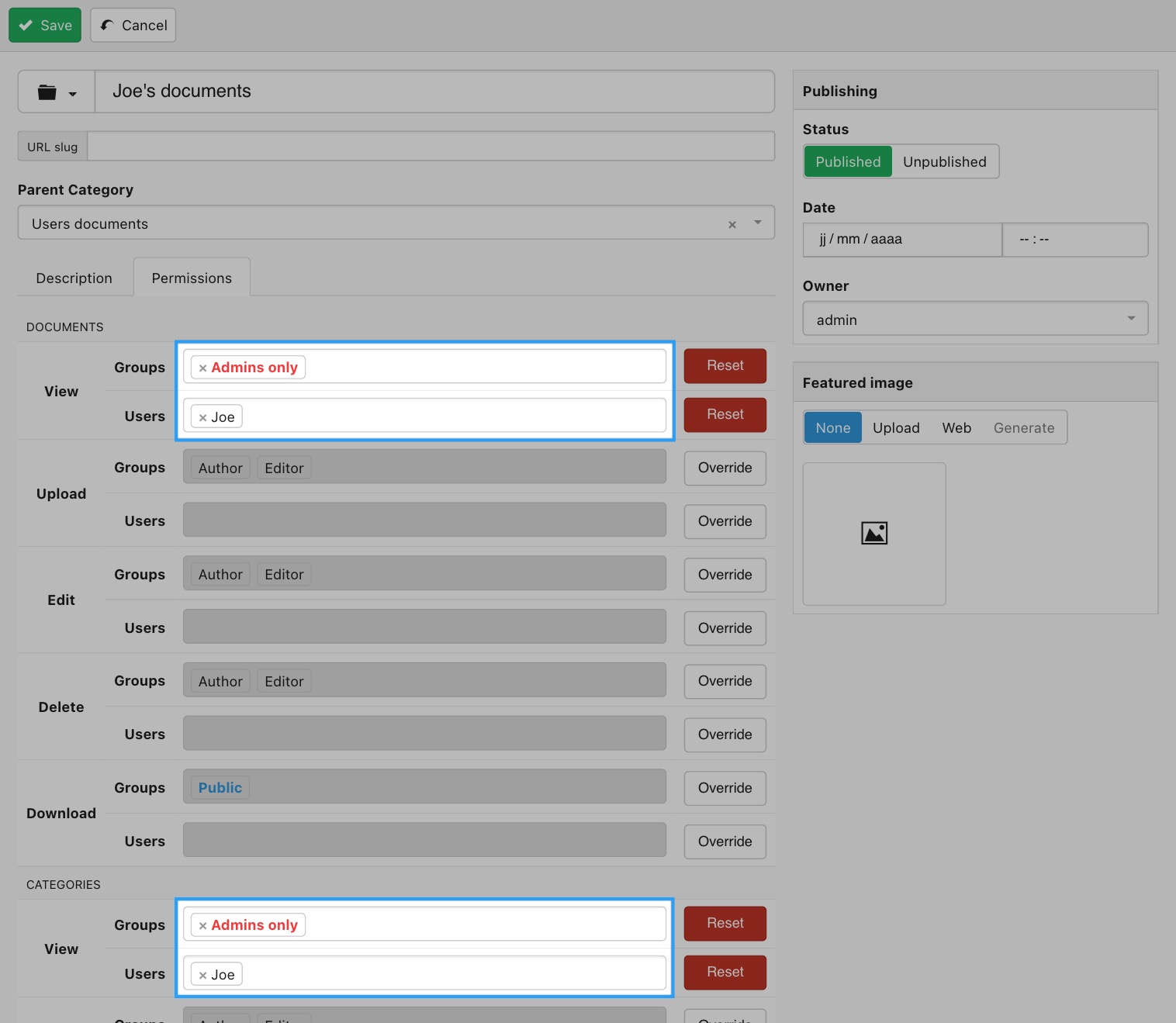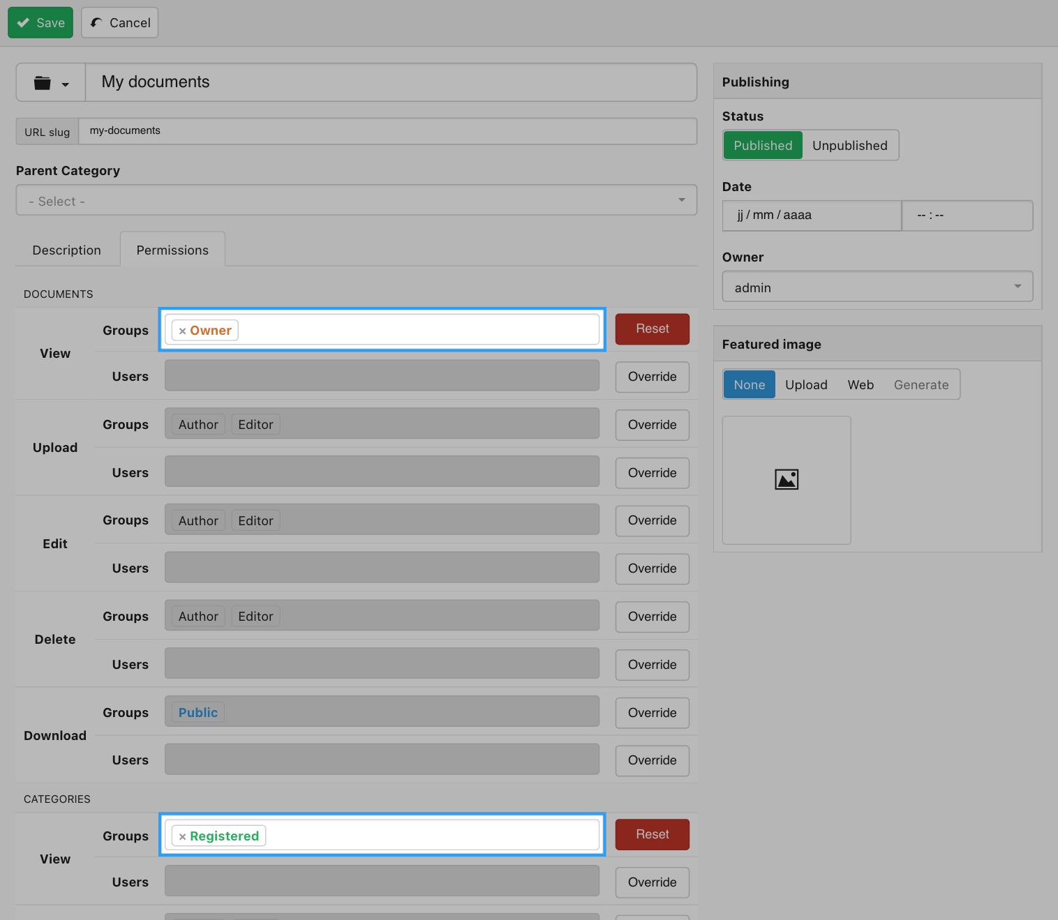 - Under Permissions click on the override button and set Categories View so that only Registered user groups can view the category. Then click on the override button and set Document View to Owner so that users can only see their own documents. Additionally, and if you'd like registered users to be able to upload their own documents themselves, you must also set the Upload documents action to Registered so that they are able to add documents in this category.