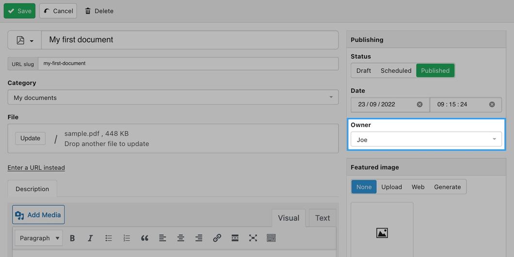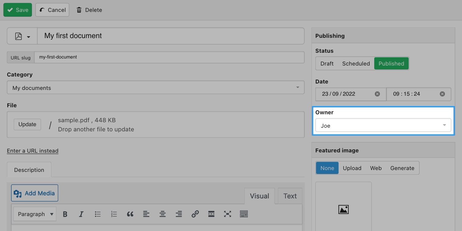 - By an administrator: the administrator needs to change the ownership of the document to a specific user to make it appear in their documents area. Administrators can do this while adding a new document or while editing an existing one. Document ownership can be modified in the document form by simply changing the user on the Owner selector.