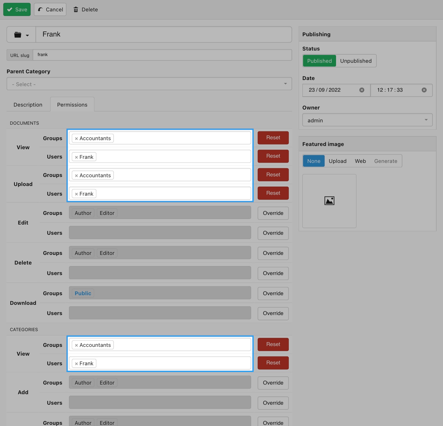 Note: If you are assigning individual accountants to individual customers, set the above Groups to Admins only and add the accountant's permissions as a User, alongside Frank, instead.